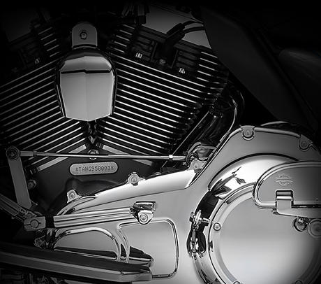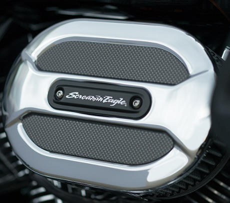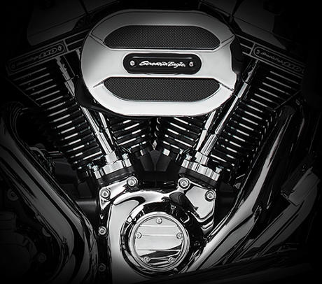 Der stilvolle, kraftsstotzende Twin-Cooled Twin Cam 110 bietet alles, was nur eine Maschine aus dem Custom Vehicle Operations™ Programm zu bieten vermag. Zwischen dem gespreizten „V" der Zylinder befindet sich der „Ventilator" Hochleistungsluftfilter mit High-Flow Filterelement, Diamond-Cut Screamin' Eagle® Emblem und Regenschutz. So ist für eine problemlose Luftzufuhr gesorgt, die die geballte Power des Motors noch verstärkt. So einzigartig wie exklusiv – eben typisch CVO!