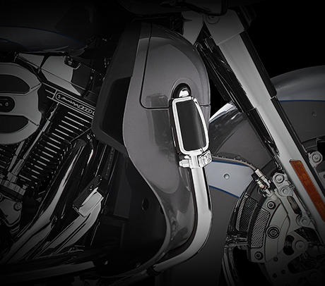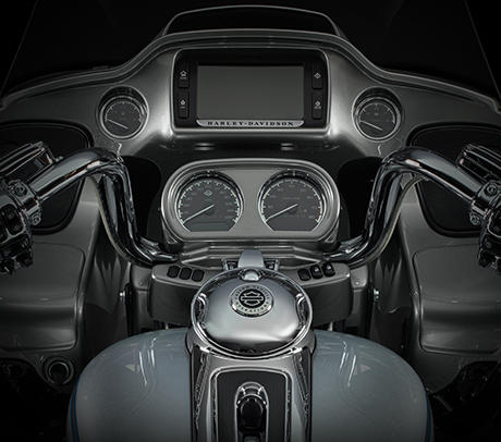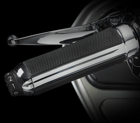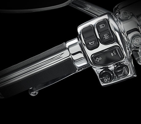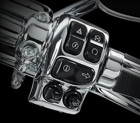 Es ist schwer, die Fahrt zu genießen und sich auf den Verkehr zu konzentrieren, wenn die Schalter am Lenker umständlich zu bedienen sind. Deshalb hat Harley-Davidson den Lenkerarmaturen der neuen Touring Maschinen genauso viel Aufmerksamkeit geschenkt, wie dem Rest der Bikes. Sie sind nun ergonomischer gestaltet und exakt so positioniert und ausgerichtet, dass Sie perfekt unter Ihrem Daumen liegen. Harley-Davidson hat eine leicht aktivierbare Geschwindigkeitsregelanlage, griffgünstige Bedienelemente für die Infotainment Funktionen und einen leicht greifbaren Trigger zur Aktivierung der Displayanzeigen angebracht. Zudem wird jetzt jede Tastenaktivierung durch ein vertrauenseinflößendes, fühlbares Klicken bestätigt. Auch der Zündschalter wurde optimiert. Und die elektrische Anlage ist bereits auf das einfache Customizing mit weiterem elektrischen Parts and Accessories vorbereitet.