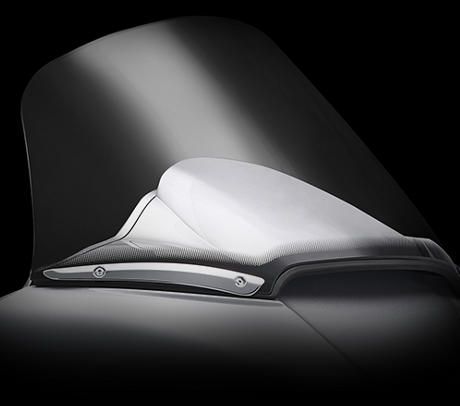 Die 34 cm hohe Windschutzscheibe der CVO Road Glide Ultra mit verchromtem Rahmen bietet optimalen Windschutz.