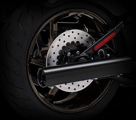 Die Räder der CVO Pro Street Breakout® sind eine Show für sich. Die Niederquerschnittsreifen machen sich großartig auf den Aggressor Fünfspeichenrädern. Die brünierte Verchromung macht echt was her. Das satte, dunkle Finish passt perfekt zum bösen Image. So etwas hat man bislang an keinem Motorrad gesehen.