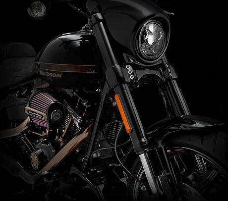 Auch das Front End der CVO Pro Street Breakout® ist eines echten Muscle Bikes würdig. Ein neuer, gechoppter Frontfender, eine 43 mm Upside-Down-Gabel mit schwarzen Tauchrohren und eine neue Gabelbrücke mit je drei dicken Klemmschrauben auf jeder Seite. Der extreme Lenkkopfwinkel unterstreicht zusätzlich den aggressiven Auftritt der Maschine.