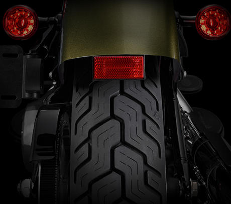 Der schmale Hinterradreifen und der gechoppte Fender mit den in die Blinkleuchten integrierten Brems- und Rückleuchten und die niedrige, mittig angebrachte Kennzeichenhalterung bestimmen das schlanke Heck, das den geradlinigen, klassischen Bobber-Style unterstreicht.