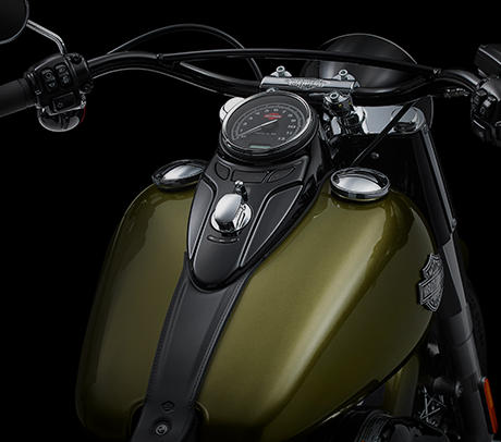 Das Design der Softail Slim® unterstreicht eindrucksvoll die lange Tradition von Harley-Davidson. Ihr einzigartiger Lenker im Retro-Style erinnert an die glorreichen Tage der Bobber der 40er Jahre. Eine weitere Hommage an die Ära des Swing sind die glänzend schwarze Scheinwerferabdeckung und die Cat Eye-Tankkonsole mit Retro-Tachometer.