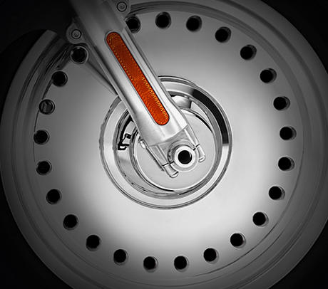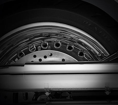 Die hochglanzverchromten Räder im Bullet Holes Style sprechen für sich selbst. Die perfekte Ergänzung zum fetten Look der Fat Boy.