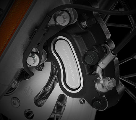 Am Handbremshebel dieser Softail sind besonders geringe Handkräfte erforderlich. Zugleich punktet die Bremse mit perfekter Dosierbarkeit und hervorragendem Ansprechverhalten. Dafür bürgen der Hauptbremszylinder mit besonders großem Kolbendurchmesser, der steif ausgelegte Vierkolbenbremssattel mit 34 und 32 mm großen, speziell beschichteten Kolben und die 300 mm große Bremsscheibe am Vorderrad.