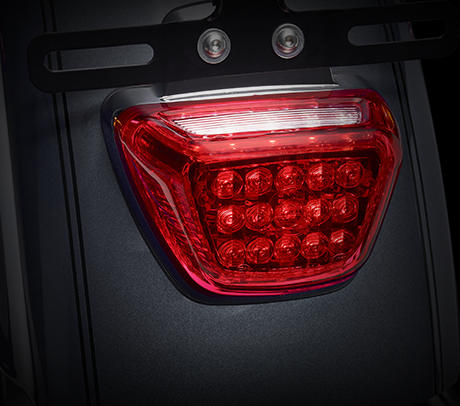 Dezent im Look, aber groß und hell, wenn Sie es wirklich brauchen. Das LED-Rücklicht der Sportster® 1200 Custom Limited Edition B passt perfekt zur Kontur des Heckfenders, und die Anordnung reaktionsschneller roter Leuchtdioden ist weder bei Tag noch bei Nacht zu übersehen. Eng an das Rücklicht schmiegt sich die Halterung für das Kennzeichen.
