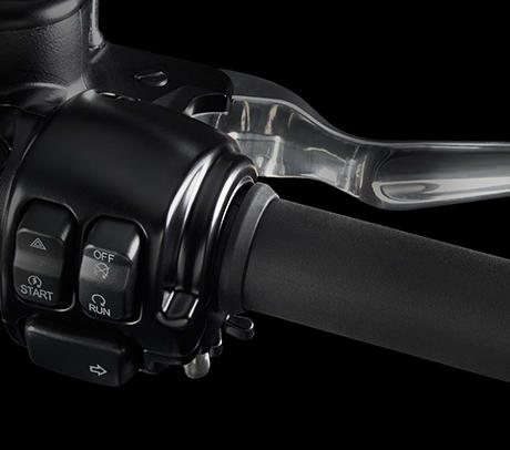 Wenn Sie den Lenker und die Lenkerarmaturen bequem ergreifen können, fühlen Sie sich auf Ihrem Motorrad wohl. Und das ist gerade dann der Fall, wenn Sie am Gasgriff einer Harley-Davidson drehen. Es fühlt sich gut an, und es ist komfortabel. Sie sind mit sich, Ihrem Bike und der Straße im Einklang. Bei der Entwicklung der neuen Lenkerarmaturen haben wir keine Mühen gescheut, um die Bedienung so intuitiv, sanft und reibungslos wie möglich zu gestalten. Damit Sie sich auf das konzentrieren können, was Sie hinter der nächsten Kurve erwartet und nicht auf das, was unter Ihren Daumen liegt. Dazu gehören Funktionen wie die selbstrückstellenden Blinker, und Bremshebel, die Sie mühelos ergreifen. Neu sind auch der Trip Switch und der Starter, denn die Zündung wird an allen Sportster Modellen schlüssellos aktiviert. Vermeintliche Details, die Ihnen unterwegs äußerst hilfreich sein werden, vermeintliche Details, für die Harley-Davidson bekannt ist.