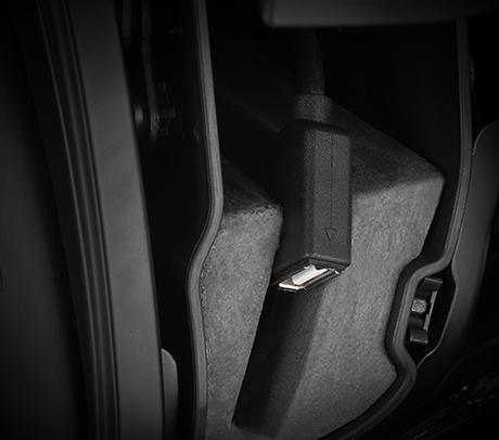 Auf Tastendruck öffnet sich die Jukebox. An den USB-Anschluss können Sie ein iPhone, einen iPod oder andere Speichermedien anschließen. Das System kann per Sprachbefehl oder Tastendruck angesteuert werden.