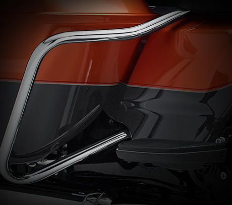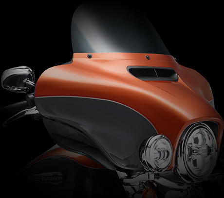 Um dem Fahrtwind Paroli zu bieten, zog Harley-Davidson alle Register: Strömungsmechanik und komplizierte Algorithmen auf Supercomputern sowie die Rückmeldungen von unzähligen Windkanaltests mit Fahrern im Sattel. Danach ging es für Tausende von Meilen hinaus auf die Straße – mit echtem Fahrtwind, echtem Sturm, echtem Nieselregen und echten Wolkenbrüchen. Das Ergebnis: Eine klassische und dennoch vollkommen überarbeitete Batwing Verkleidung, die für eine sanftere Luftumströmung sorgt und die Verwirbelungen im Kopfbereich reduziert. Der neue, auf Tastendruck zu öffnende und zu schließende Luftkanal leistet den größten Beitrag dazu. Das Gefühl im Sattel wird noch besser.