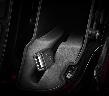 Auf Tastendruck öffnet sich die Jukebox. An den USB-Anschluss können Sie ein iPhone, einen iPod oder andere Speichermedien anschließen. Das System kann per Sprachbefehl oder Tastendruck angesteuert werden.