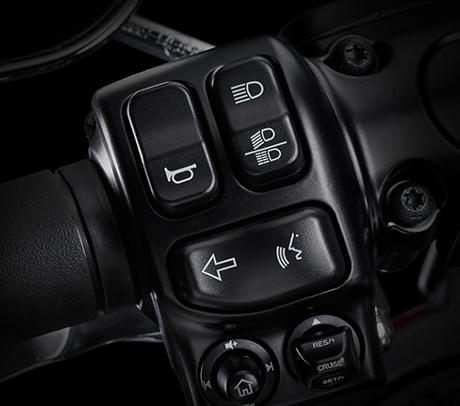 Es ist schwer, die Fahrt zu genießen und sich auf den Verkehr zu konzentrieren, wenn die Schalter am Lenker umständlich zu bedienen sind. Deshalb haben wir den Lenkerarmaturen unserer neuen Project RUSHMORE Touring Maschinen genauso viel Aufmerksamkeit geschenkt, wie dem Rest der Bikes. Sie sind nun ergonomischer gestaltet und exakt so positioniert und ausgerichtet, dass Sie perfekt mit dem Daumen bedient werden können. Wir haben eine leicht aktivierbare Geschwindigkeitsregelanlage, griffgünstige Bedienelemente für die Infotainment-Funktionen und einen gut zu erreichenden Trigger zur Aktivierung der Displayanzeigen angebracht. Zudem wird jetzt jeder Tastendruck durch ein spürbares Klicken bestätigt. Auch der Zündschalter wurde optimiert. Und die elektrische Anlage ist bereits für die Erweiterung durch zusätzliche Parts and Accessories vorbereitet.