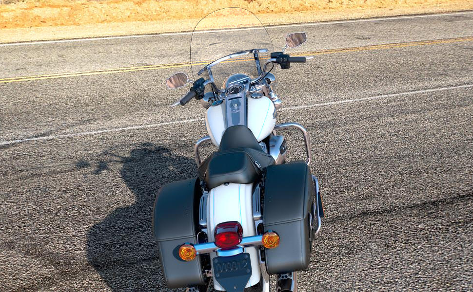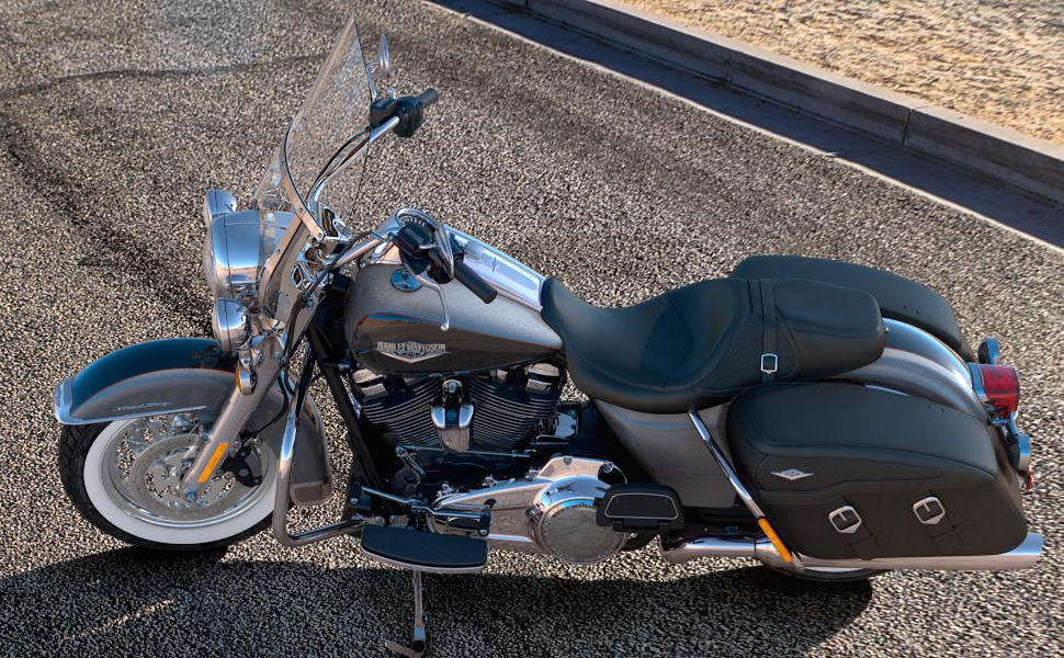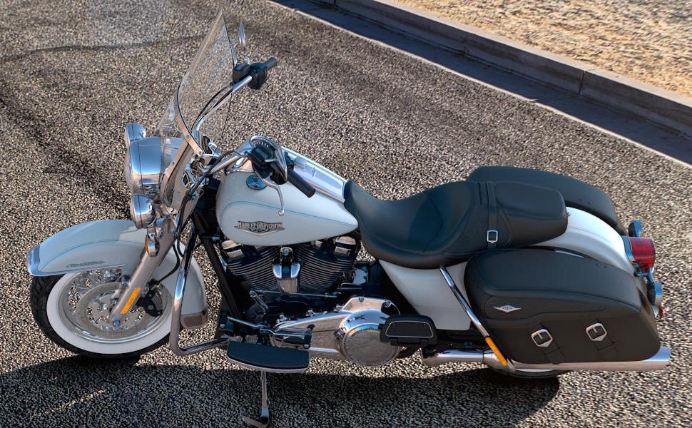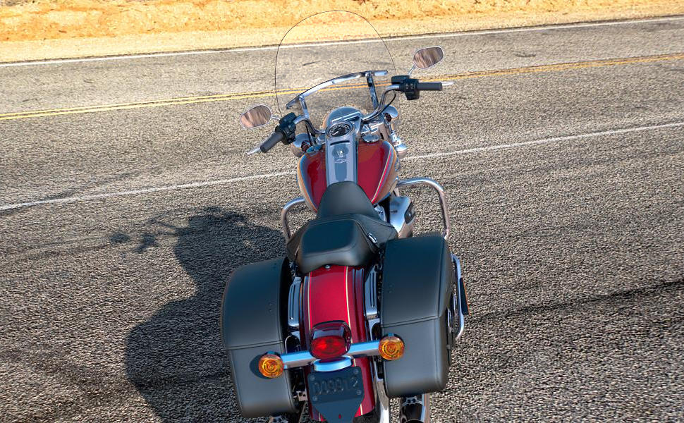 Weißwandreifen auf Speichenrädern und lederbezogene Seitenkoffer. Aus gutem Grund heißt sie Road King Classic.Preise und Daten ohne Gewähr.