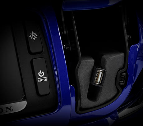 Auf Knopfdruck öffnet sich die Jukebox mit einem USB-Anschluss für iPhone, iTouch und andere Musik-Player, SD-Karten sowie weitere USB-kompatible Geräte. Öffnen Sie die Jukebox, schließen Sie ihr Gerät an, und es wird Teil Ihres Motorrads. Es lässt sich manuell oder über Sprachbefehle bedienen.
