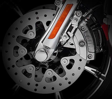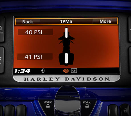 Der große 6,5-Zoll-Farb-Touchscreen der CVO™ Street Glide® zeigt alle Informationen übersichtlicher als je zuvor. Darunter jetzt erstmals: Reifendruckkontrollsystem mit Anzeige im Display. Vorbei die Zeiten, in denen der Reifendruck umständlich an der Tankstelle kontrolliert werden musste. Heute genügt ein Blick aufs Display, um zu wissen, dass man beruhigt fahren kann. Eine zusätzliche Warnleuchte erhöht die Sicherheit noch weiter.