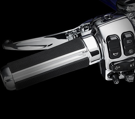 Klassischer Stil und maximaler Komfort. Die CVO Street Glide® ist serienmäßig mit diesem breiten, ausgewogen geschwungenen Lenker ausgestattet. Dieser Lenker ist darauf ausgelegt, eine bequeme Sitzhaltung zu gewährleisten, und hilft Ihnen auch auf langen Strecken, Verspannungen der Nackenmuskulatur zu vermeiden. Robuster Edelstahl bietet genau die Steifigkeit, die Sie bei einer Harley-Davidson® erwarten - im dunklen, glänzenden Finish.