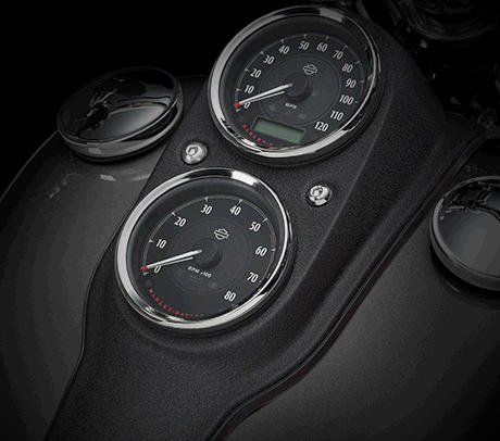 Auf dem klassischen Fat Bob® Tank der Low Rider® thront eine neue Instrumentenkonsole in Wrinkle Black. Der Look passt zum Wrinkle Black am Antriebsstrang und an den Fender Struts. Und er ergibt einen faszinierenden Kontrast zum glänzenden Vivid Black des Tanks. Schwarz ist eben nicht gleich Schwarz.