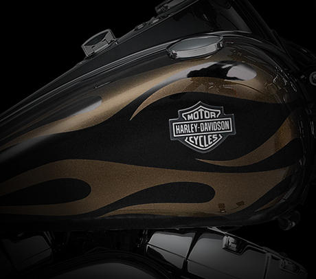 In Vivid Black kommt die Wide Glide® puristisch und finster daher. Wer es heißer mag, wählt das klassische Flames-Dekor auf dem Tank, eine optische Reminiszenz an die 1970er Jahre. Dieser optional erhältliche Custom-Look zieht die Blicke magisch auf sich.