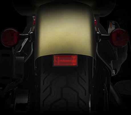 Der schmale Hinterradreifen und der gechoppte Fender mit den in die Blinkleuchten integrierten Brems- und Rückleuchten und die niedrige, mittig angebrachte Kennzeichenhalterung bestimmen das schlanke Heck, das den geradlinigen, klassischen Bobber-Style unterstreicht.