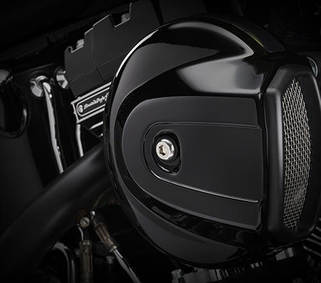 Wenn Sie zwischen den mächtigen Zylindern auf der Softail Slim sitzen, werden Sie einen schwarzglänzenden, runden Luftfilter mit hohem Luftdurchsatz sowie einen schwarzglänzenden Filter und die Rückplatte sehen. Das Bikes ist mit einem Filter mit hohem Durchsatz ausgestattet, der den Motor mit enormen Mengen Luft versorgt, die er in eine enorme Menge Power verwandelt.