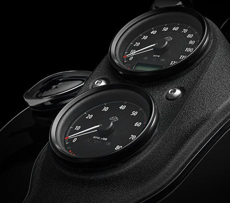 Bei der Low Rider S glänzt Dunkelheit in allen Schattierungen. Von der flüssig schimmernden Lackierung des Tanks in Vivid Black hebt sich das Black Wrinkle der Konsole deutlich ab. Darin untergebracht sind Tachometer und Drehzahlmesser, natürlich mit schwarzen Zierringen veredelt.
