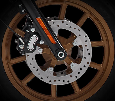 Die Alugussräder mit Fünf Doppelspeichen unterstreichen den kraftvollen, klassischen Look der Low Rider S. Sie kommen in einer neuen Magnum Gold Farbe daher, die auf die Farbe des Tankemblems abgestimmt ist.
