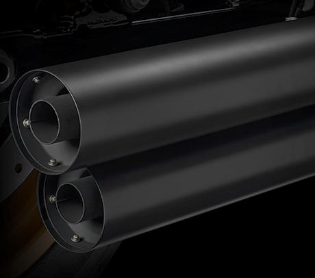 Die Low Rider S entlässt ihr Grollen über eine schwarze zwei-in-zwei Collector-Auspuffanlage im Shotgun-Stil mit Doppelschalldämpfern. Aus der Nähe lassen sich Schlitze in den Auspuff-Hitzeschilden erkennen, die den aggressiven Look zusätzlich unterstreichen.