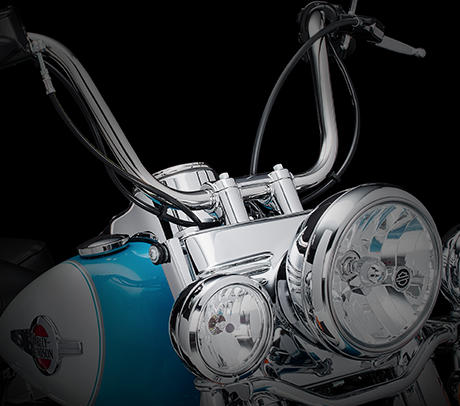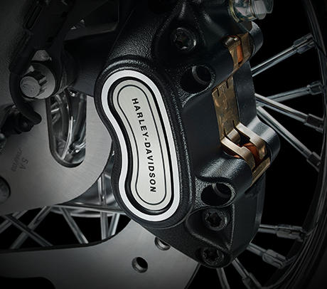 Am Handbremshebel der Softail sind besonders geringe Handkräfte erforderlich. Zugleich punktet die Bremse mit perfekter Dosierbarkeit und hervorragendem Ansprechverhalten. Dafür bürgen der Hauptbremszylinder mit besonders großem Kolbendurchmesser, der steif ausgelegte Vierkolbenbremssattel mit 34 und 32 mm großen, speziell beschichteten Kolben und die 300 mm große Bremsscheibe am Vorderrad.