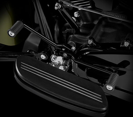 Die durchgehenden Fahrertrittbretter mit Schaltwippe der Road King Special bieten den Füßen soliden, sicheren Halt.