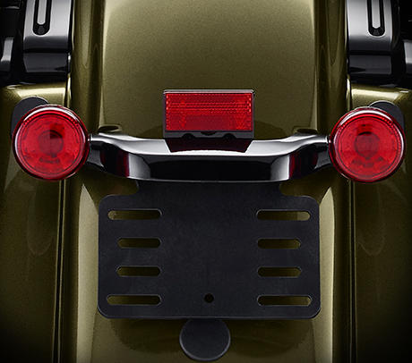 Der Look der Road King Special ist auf das Wesentliche reduziert und äußerst minimalistisch gehalten. Das verdeutlicht auch das Custom Rücklicht und das tief montierte Nummernschild, die mit so wenig Material wie möglich auskommen, damit nichts den Anblick des schlanken Fenders, der länglichen Satteltaschen und des eleganten, aggressiven Profils stört.