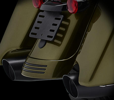 Die strenge Symmetrie und gute Ausgewogenheit der schwarzen 2-1-2-Dual-Auspuffanlage fügt sich perfekt in die modern, aggressiv gestaltete Seitenansicht der Road King® Special ein. Dank den konischen, eleganten Schalldämpfern und dem satten Sound erkennt man schon aus weiter Ferne, dass es sich um eine Harley-Davidson handelt.