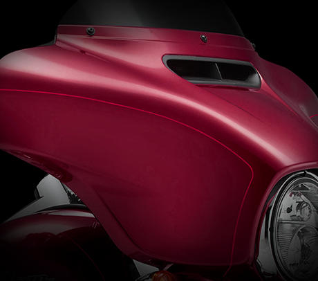 So optimiert Harley-Davidson die Aerodynamik: Strömungsmechanik, Algorithmen, Hochgeschwindigkeits-Supercomputer und Abertausende von Windkanal-Tests mit echten Bikern im Sattel, die uns ihre Eindrücke schildern. Und all das, bevor wir auf der Straße Tausende von Kilometern mit realen Windböen und echtem Regen zurückgelegt haben. Das Ergebnis: Eine Batwing-Verkleidung, die für einen gleichmäßigeren Luftstrom bürgt und Helmturbulenzen minimiert. Das leistet zum großen Teil der Druckausgleich durch den Strömungskanal an der Front. Er lässt sich mit einem Tastendruck öffnen und schließen. Der Fahrkomfort ist nochmals spürbar gewachsen.