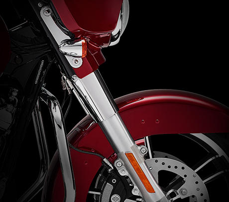 Die diesjährigen Touring-Modelle, die mit dem brandneuen Milwaukee-Eight Motor ausgerüstet sind, sind auch mit einer völlig neu konstruierten Double Bending Valve Vorderradgabel und einer Heckfederung mit einfach einstellbaren Emulsionsstoßdämpfern ausgestattet. Für mehr Komfort, eine bessere Kontrolle und ein höheres Vertrauen in das Handling wurde das Fahrwerk um einen Zoll tiefer gelegt. Neue Federbeine bieten 15 bis 30 % mehr Vorspannung. Sie lassen sich durch Drehen an einem einzigen Knopf ohne Werkzeug einstellen. Mit 23 Umdrehungen wird ein Höhenunterschied von 25 mm erreicht. Neue, größere Kolben mit mehr Fläche als zuvor bieten eine verbesserte Dämpfung über den gesamten Federweg. Die neue Double Bending Valve (DBV) Vorderradgabel bietet 117 mm Federweg. Die neue Free-Valve Gabeltechnologie verbessert den Fahrkomfort insbesondere auf welligem Straßenbelag. Sie spricht spontaner an, damit das Rad immer sicheren Kontakt zur Fahrbahn hält, was zuverlässiges Bremsen und bestes Handling garantiert.