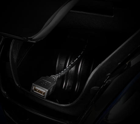 Die Jukebox der Road Glide® ist mit einem USB-Anschluss für iPhone, iTouch und andere Musik-Player, Speicherkarten-Lesegeräte sowie weitere USB-kompatible Geräte ausgestattet. Öffnen Sie die Jukebox, schließen Sie ihr Gerät an, und es wird Teil Ihres Motorrads. Es lässt sich manuell oder über Sprachbefehle bedienen.