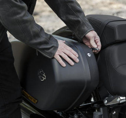 Abschließbare Seitenkoffer serienmäßig. Dank der leicht abnehmbaren Koffer lässt sich die Sport Glide in Minutenschnelle vom Custom Touring Bike in einen minimalistischen, stilvollen Cruiser verwandeln.
