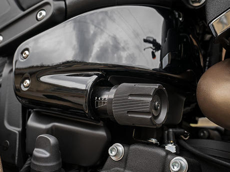 Die 2-1-2-Auspuffanlage mit hochgezogenen Schalldämpfern in Custom-Kontrast sorgt für fein abgestimmte Leistung. Und nicht zuletzt für das sonore Harley-Grollen.