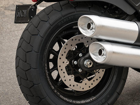 Auffällige Aluminiumräder mit breiten, aggressiven Reifen passen haarscharf zur Optik der Fat Bob.