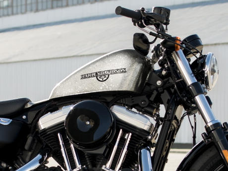 - Der kleine, 7,9 Liter fassende Peanut-Kraftstofftank feierte seine Premiere an einem Harley-Davidson® Motorrad im Jahr 1948 - von dieser Jahreszahl wurde auch der Modellname der Forty-Eight abgeleitet. Der Tank verleiht der Maschine den niedrigen, massiven Bulldog-Look und sorgt dafür, dass der fette Motor und der knochige Stil des schlanken Sportster-Rahmens gut sichtbar sind.
