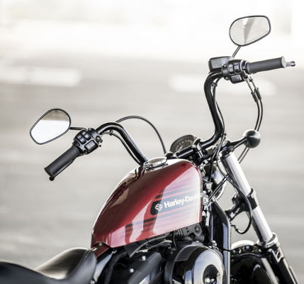 Der Tallboy-Lenker ist weniger weit nach hinten gekröpft als der Mini Ape. Ein Stil, der perfekt zur massigen Front und zum kompakten Tank der Forty-Eight Special passt: