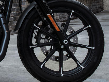 Die Iron 883 rollt auf Rädern mit 9-Speichen. Diese schwarzen Räder sind am Übergang zum Felgenhorn mit gefrästen Details verziert. Das schnörkellose Design erinnert an die Sportster-Räder der frühen 90er Jahre ... man kann den Look natürlich auch ohne Geschichtsbuch genießen.