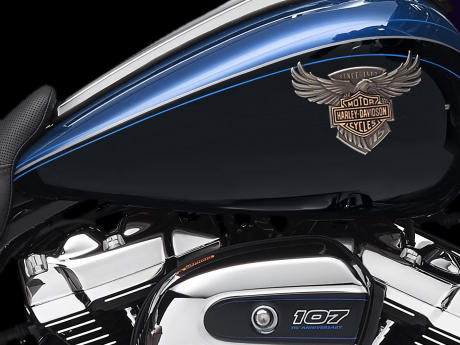 Blau wie nie in Legend Blue, der tiefblauen Farbe zum 115, Jubiläumsjahr. Zweifarbig in Legend Blue / Vivid Black. Das Aufsehen erregende, erhabene Bar & Shield-Logo auf dem blau-schwarzem Tank ist das schon von fern sichtbare Merkmal. Das Zeichen "115" in Blau auf dem Timer Cover, der passend blau abgesteppte Sitz, die feinen Streifen in Blautönen, welche die Kontur der Maschine von der Front bis zum Heck betonen, sind weitere Details des Sondermodells.
