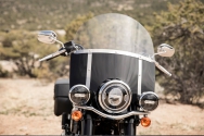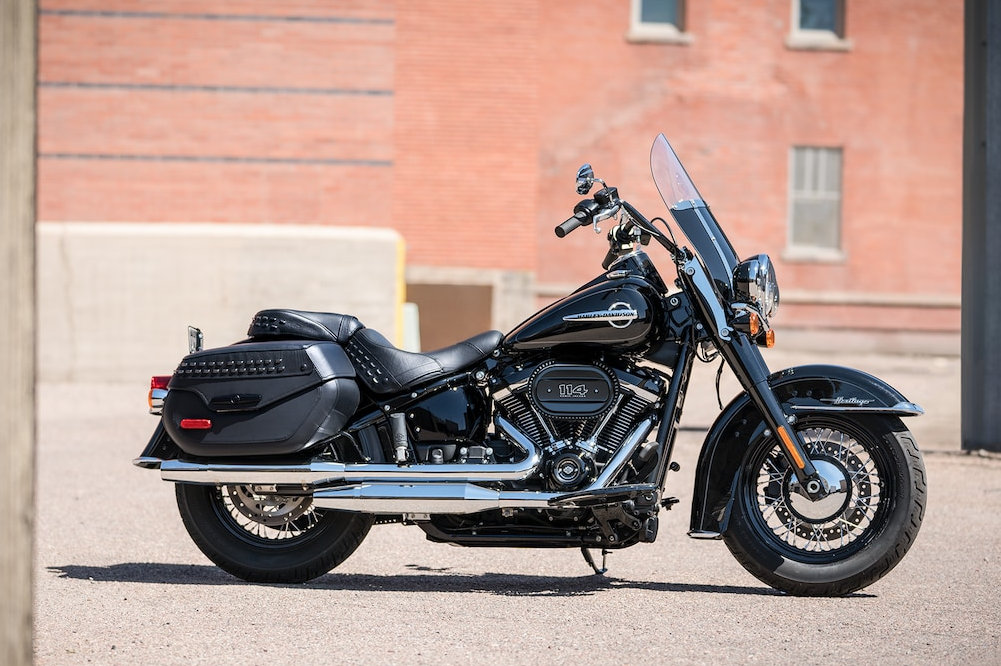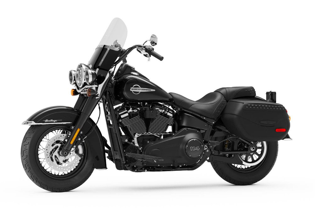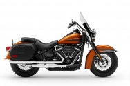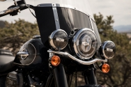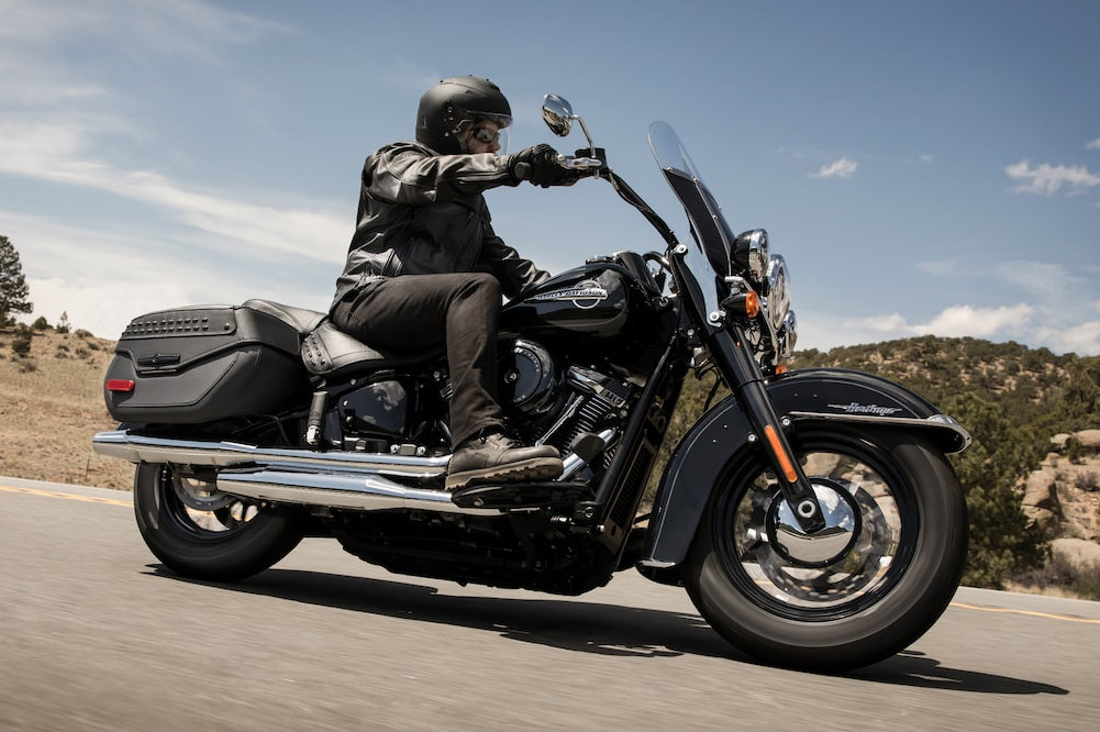 Mit ihrem zeitgemäßen Auftritt im dunklen Custom-Style verleiht die Heritage dem Begriff Nostalgie eine ganz neue Bedeutung. Sie hat sich von der Chrom-Verliebtheit getrennt und bezieht sich als Referenz an die Geschichte auf die klassischen, im dunkel.düsternen Look gehalteten, Harley-Davidson der Fünfzigerjahre. Verbunden ist diese klassische Erscheinung mit moderner Technik. Im Mittelpunkt steht der dunkle, starke Milwaukee-Eight V-Twin 114. Dann die abnehmbare Windschutzscheibe, die typischen Scheinwerfer sowie die Hartschalenkoffer im Look von Satteltaschen.