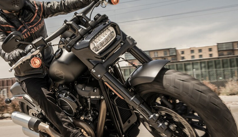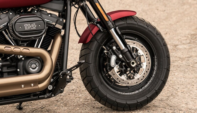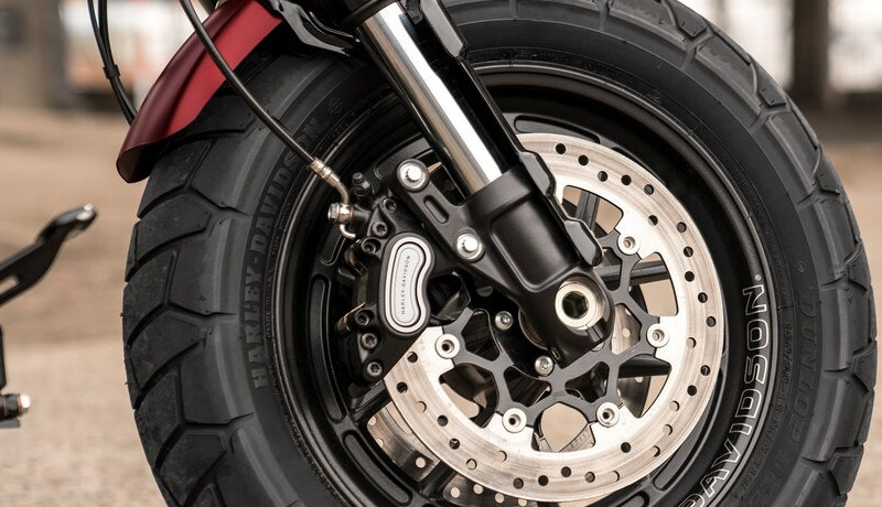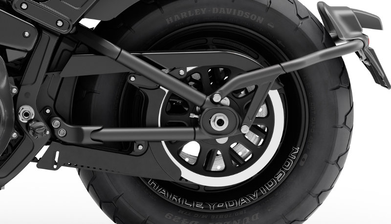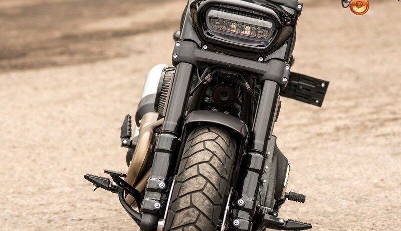 Auffällige Aluminiumräder mit breiten, aggressiven Reifen passen haarscharf zur Optik der Fat Bob. Hinten sorgt ein 180-mm breiter Reifen und vorne der 150-mm-Vorderreifen für Top-Haftung auf dem Asphalt.