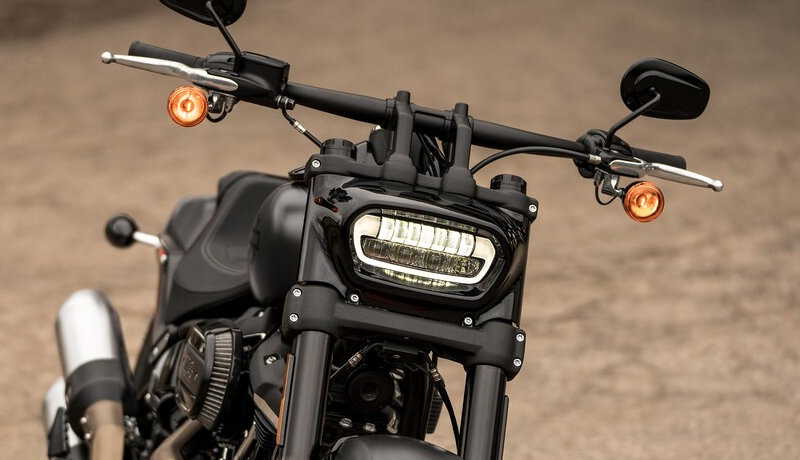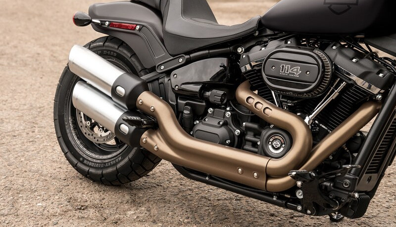 Die 2-1-2-Auspuffanlage mit hochgezogenen Schalldämpfern in Custom-Kontrast sorgt für fein abgestimmte Leistung. Und nicht zuletzt für das sonore Harley-Grollen. Das Design der Anlage verleiht der Fat Bob das gewisse Quentchen mehr zu ihrer sowieso schon agrressiven Optik.