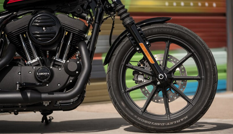 Die Maschine rollt auf schwarzen 9-Speichen-Rädern (19 Zoll vorne und 16 Zoll hinten). Diese Räder, von der Felge bis zum Reifen schwarz wie die Nacht, runden den Dark Custom-Look ab.