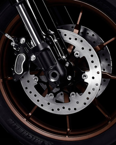 Die Doppelscheibenbremse zeichnet sich durch eine stärkere Bremsleitung bei geringerem Kraftaufwand am Handhebel aus als die einzelne Bremsscheibe der Low Rider.