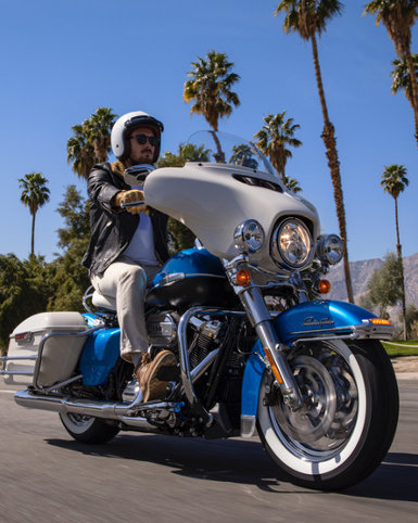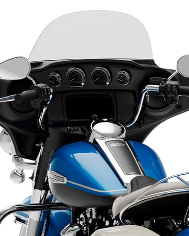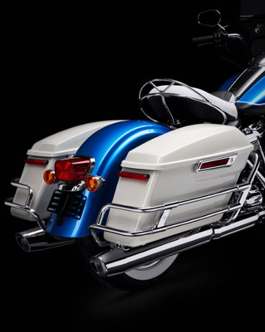 1969 wurden die Verkleidung und die Koffer nur alsweiße Glasfaserteil eangeboten, weshalb die Electra Glide Revival diesen Look mit einer Lackierung der entsprechenden Bauteile in Birch White repliziert. Das von den ausgehenden Sixties inspirierte Tankmedaillon und der Electra-Glide-Schriftzug auf dem vorderen Fender tragen das Ihre zum klassischen Stil bei. Die Electra Glide Revival wird in einer einzigen Lackierung angeboten, die ebenfalls von der ursprünglichen Farbgebung des Jahres1969 inspiriert ist: Der Tank ist zweifarbig in Hi-Fi Blue und Black Denim gehalten,die von einem Streifen in Birch White getrennt werden. Hi-Fi Blue tragen auch die Fender und die Seitendeckel.