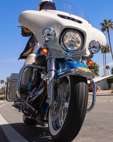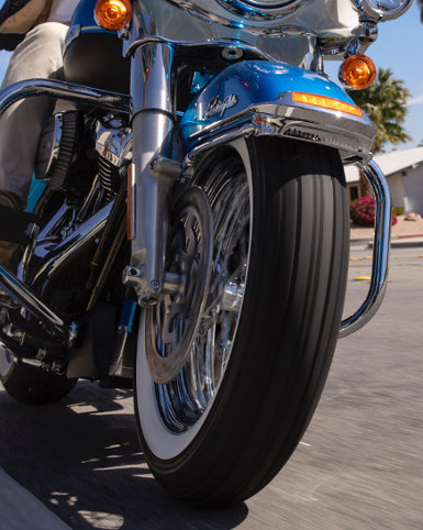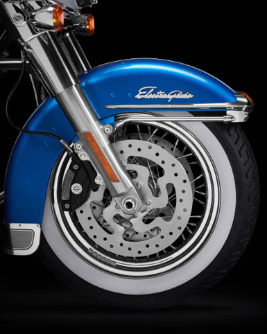 Verchromte Kreuzspeichenräder und breite Weißwandreifen tragen ebenso zum nostalgischen Look bei wie die glänzende Chromschicht an den Frontfender-und Kofferzierleisten, dem „Ventilator“-Luftfiltercover, den Gabelrohrabdeckungen und den Zusatzscheinwerfern–Design, das den Blick fesselt.