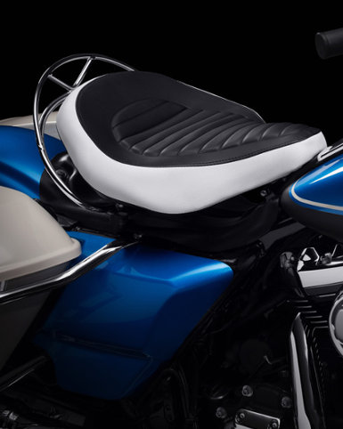 Zu den Design-Highlights derElectra Glide Revival gehört auch ein Solosattel mit schwarz-weißem Bezug und verchromter Reling. Er wurde auf einem Stoßdämpfer mit einstellbarer Spiralfeder montiert – eine weitere Hommage an die Harley-Davidson-FL-Modelle der 1960er-Jahre und ein funktionales Merkmal, das den Komfort erhöht.