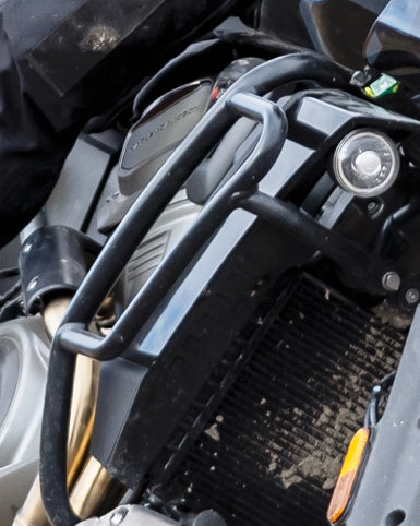 - Die Schutzbügel aus Stahlrohr schützen den Kühler vor Schäden und dienen zugleich als Handgriffe, um das Motorrad nach eventuellen Stürzen wieder aufzurichten.