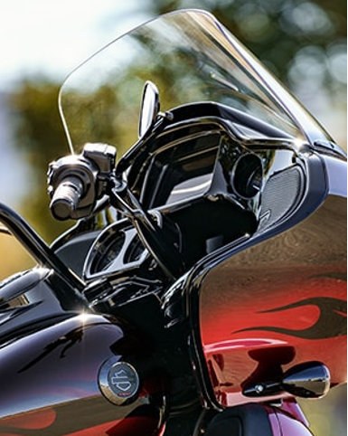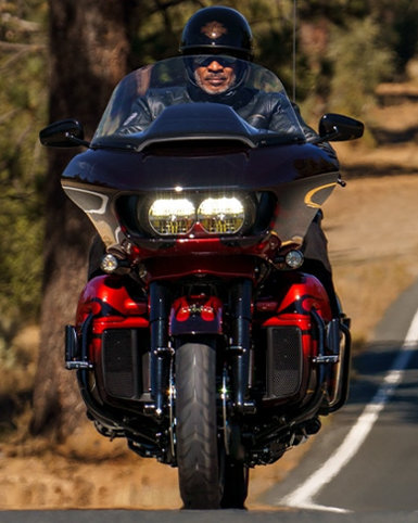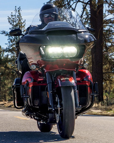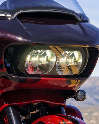 Das fortschrittlichste Scheinwerfersystem, das je für eine Harley-Davidson entwickelt wurde. Mit einem charakteristischen LED-Licht-Außenring, der als Tagfahrlicht dient, und mit zusätzlichen LED-Leuchten, die abhängig von der Schräglage des Motorrads aktiviert werden, um Bereiche der Straße auszuleuchten, die von herkömmlichen LED-Scheinwerfern unbeleuchtet bleiben.
